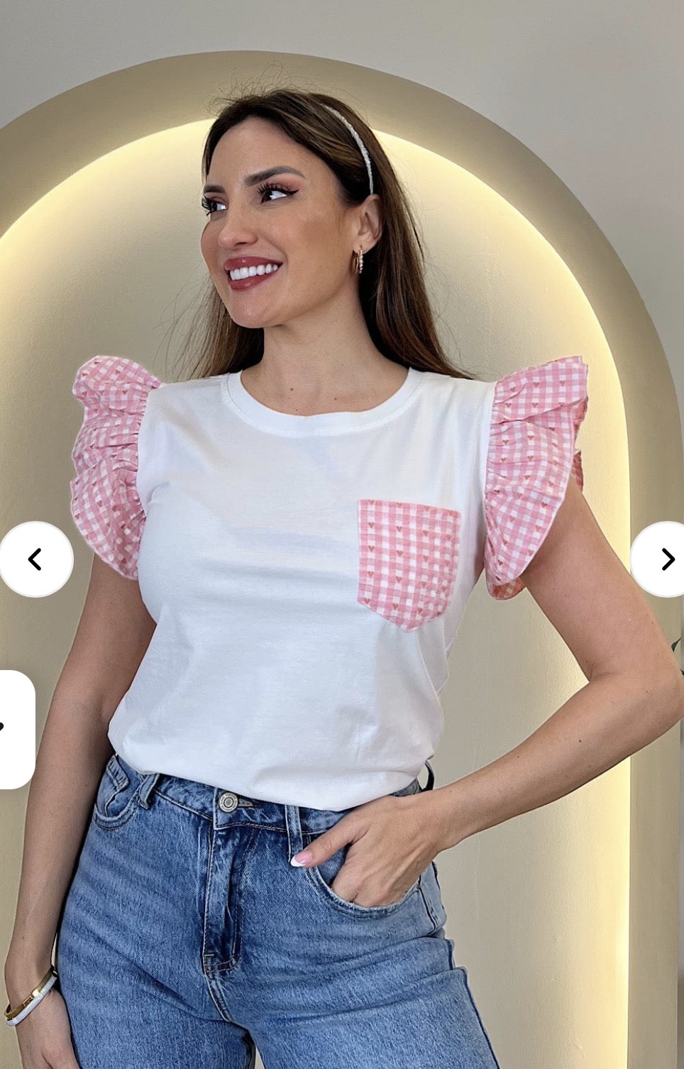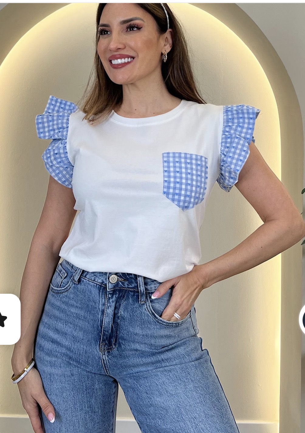 Camiseta blanca mangas cuadros vichy,azul marino,rosa y azul claro.