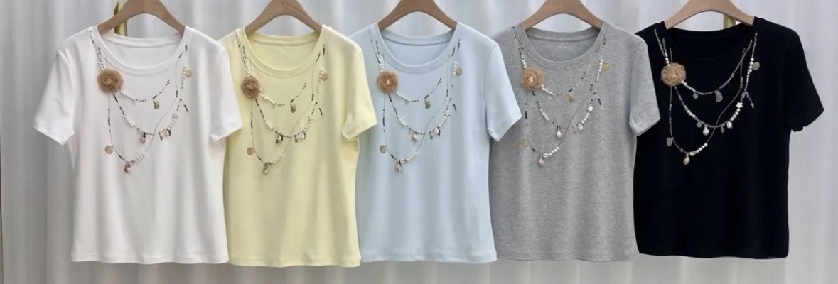 camisetas abalorios conchas y flores,efecto collar.Manga corta.