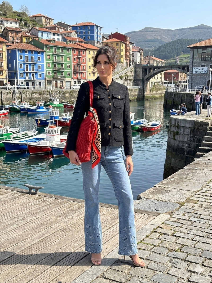 Chaqueta negra botones dorados Estilo Chanel.