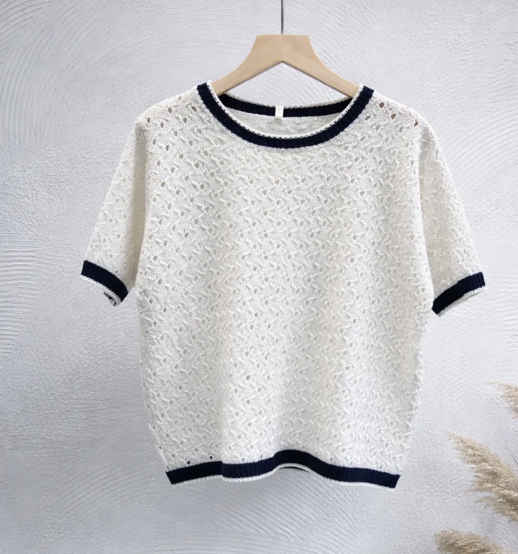 Jersey blanco con puños y cuello azul marino.Con calados.Manga corta