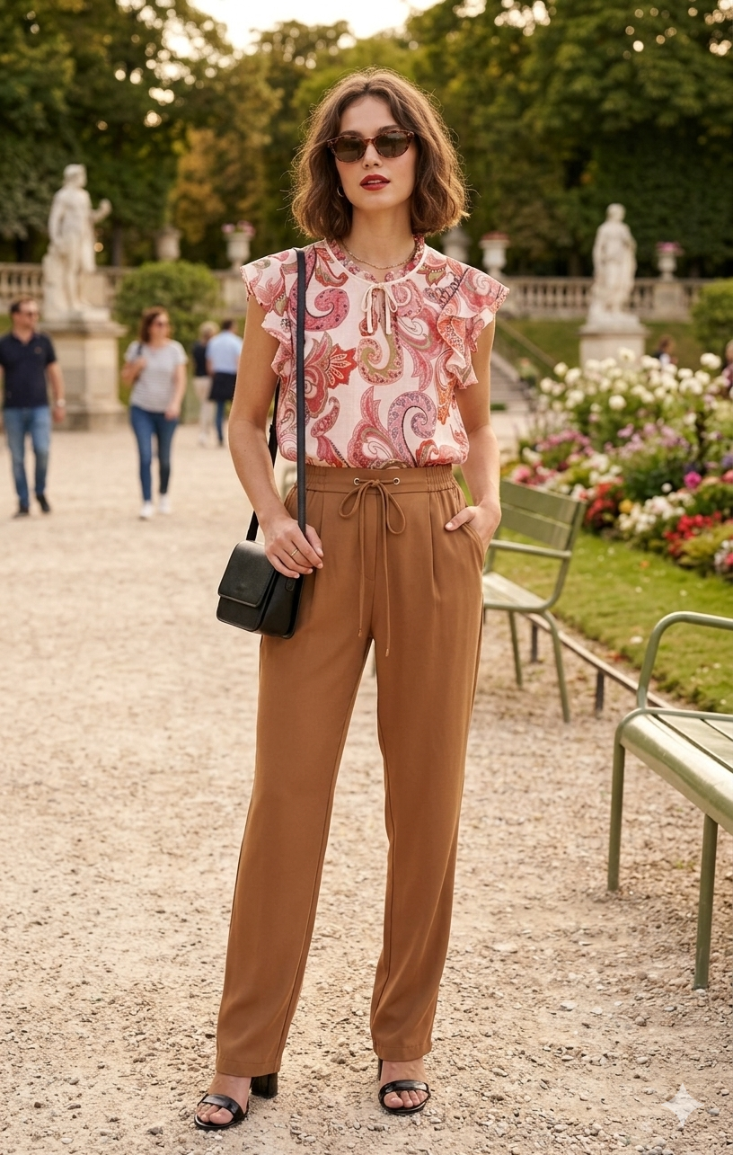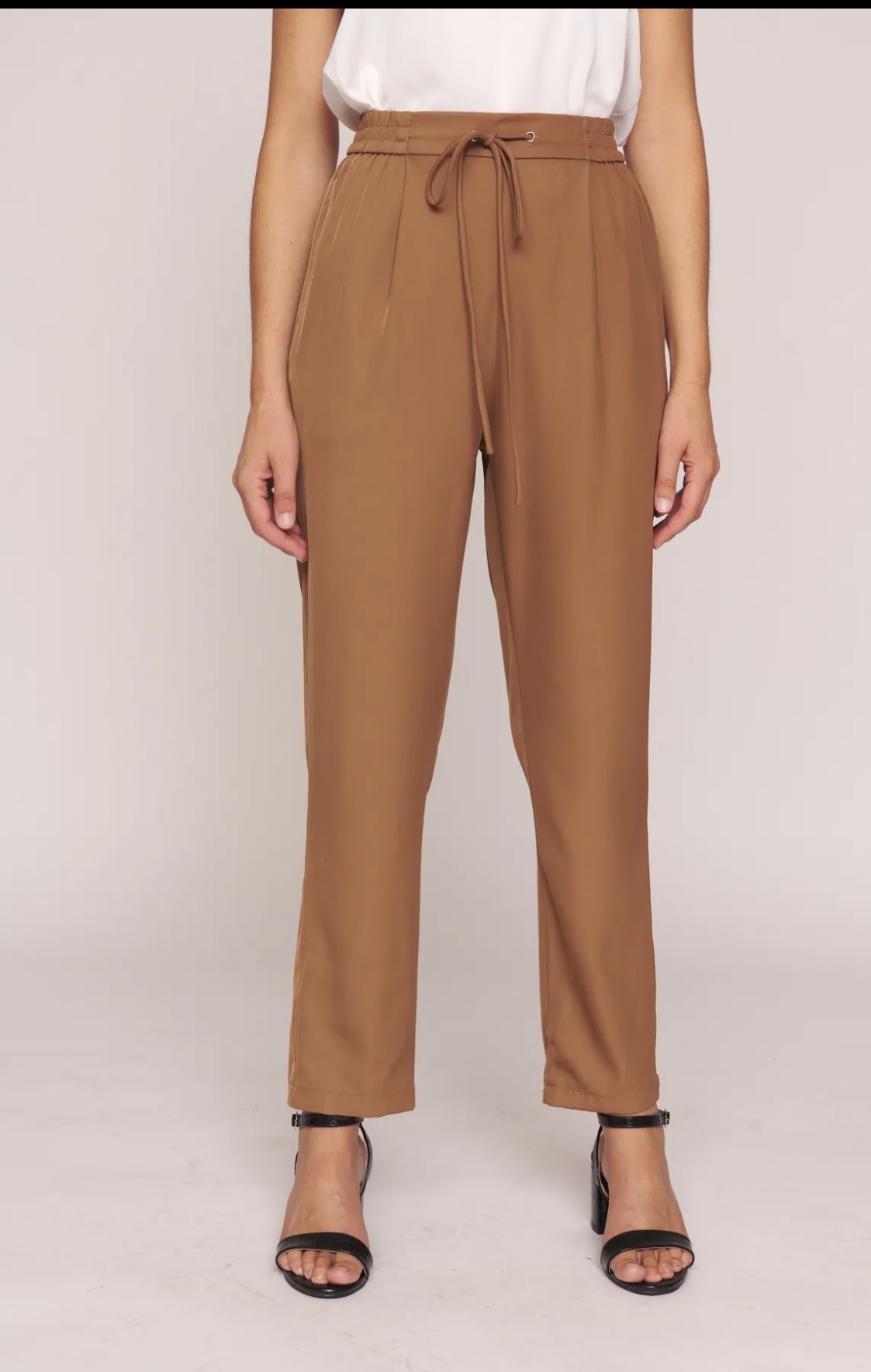 Pantalon fluido color tierra,con goma y cordon y bolsillos laterales.