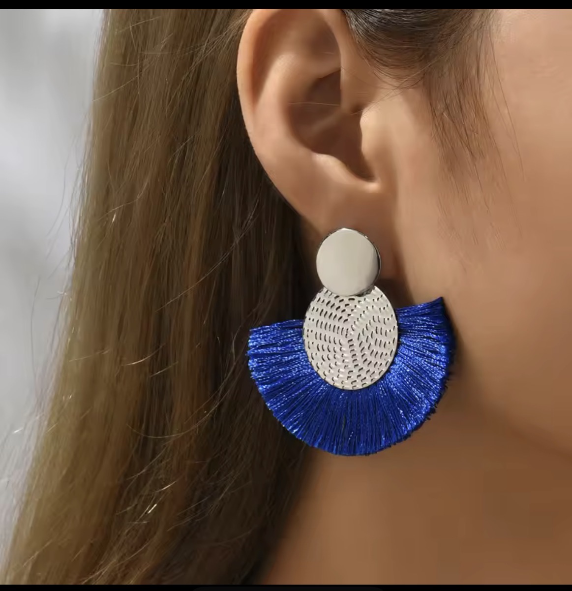 Pendientes azules y dorados flecos.