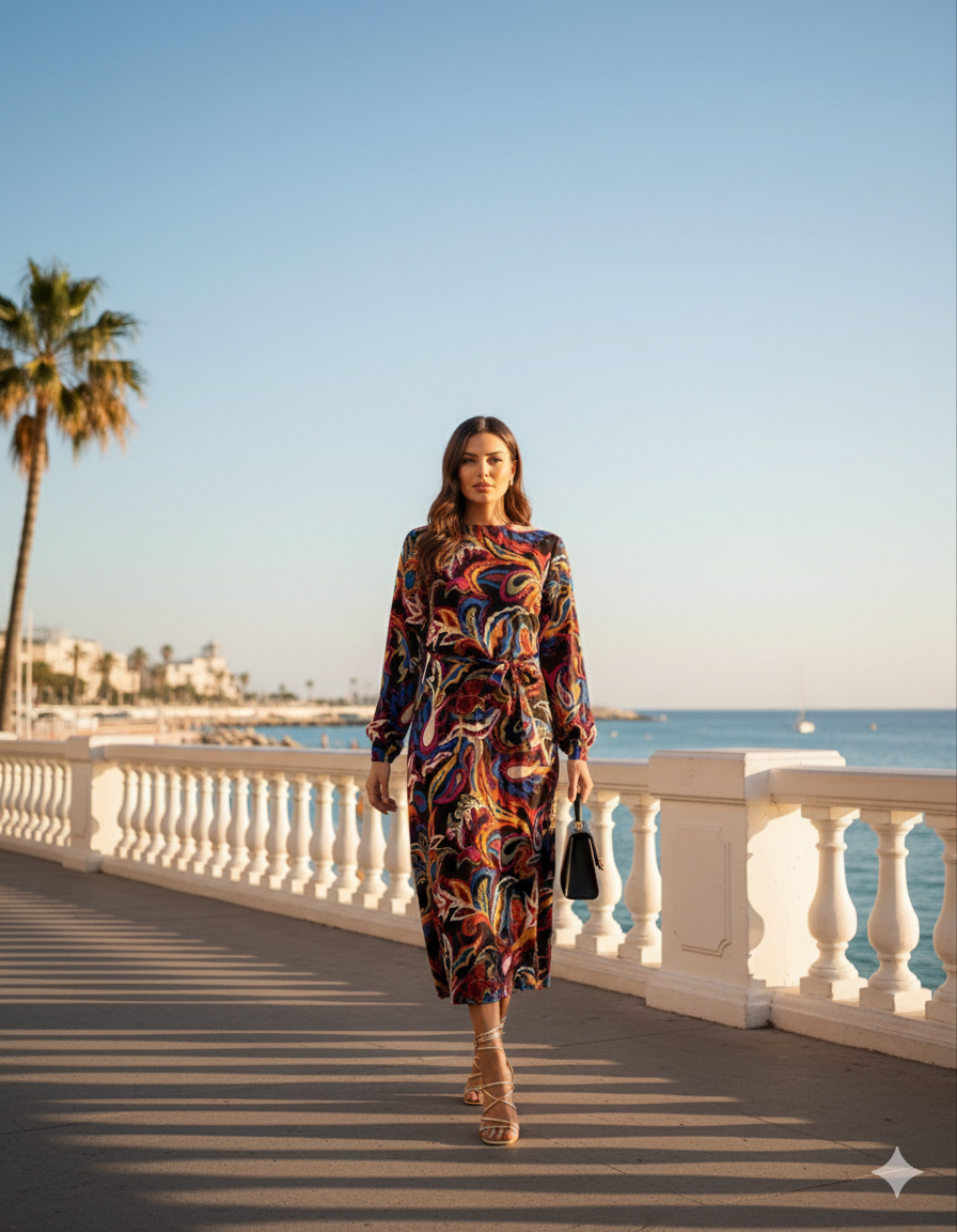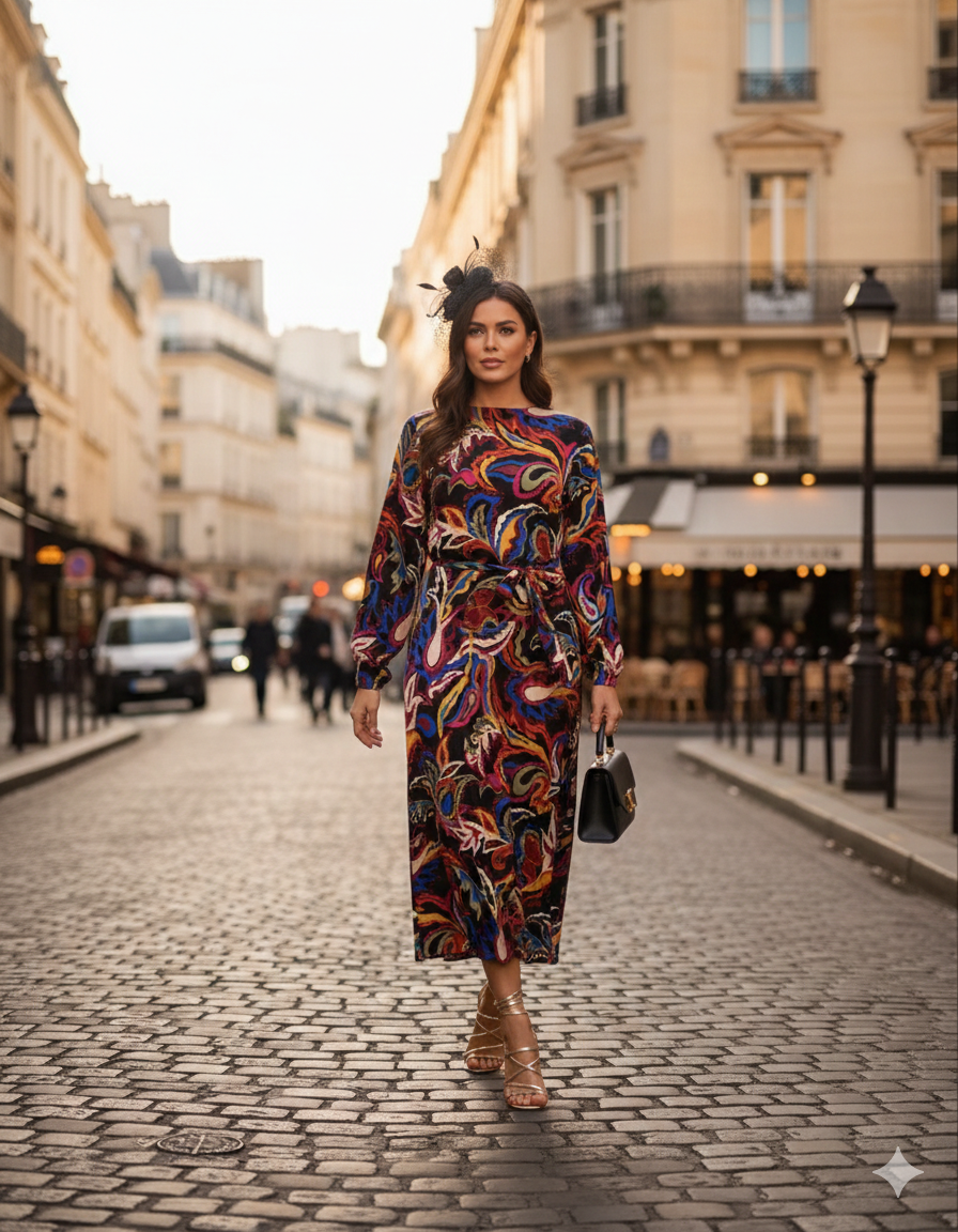 Vestidi colores,manga larga,cuello redondo y cinturon de la misma tela.