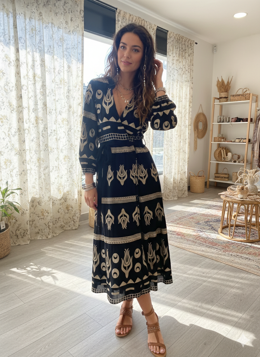 Vestido negro y dorado.Manga larga.Escote con botones y cinturon.