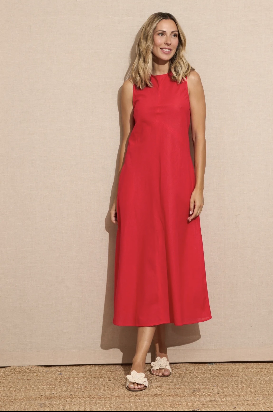 Vestido rojo ,cuello redondo sin mangas.